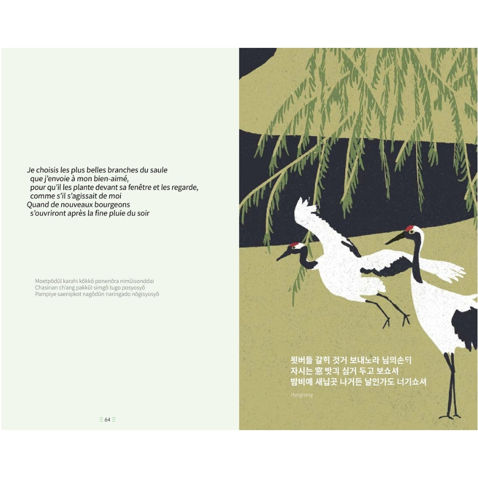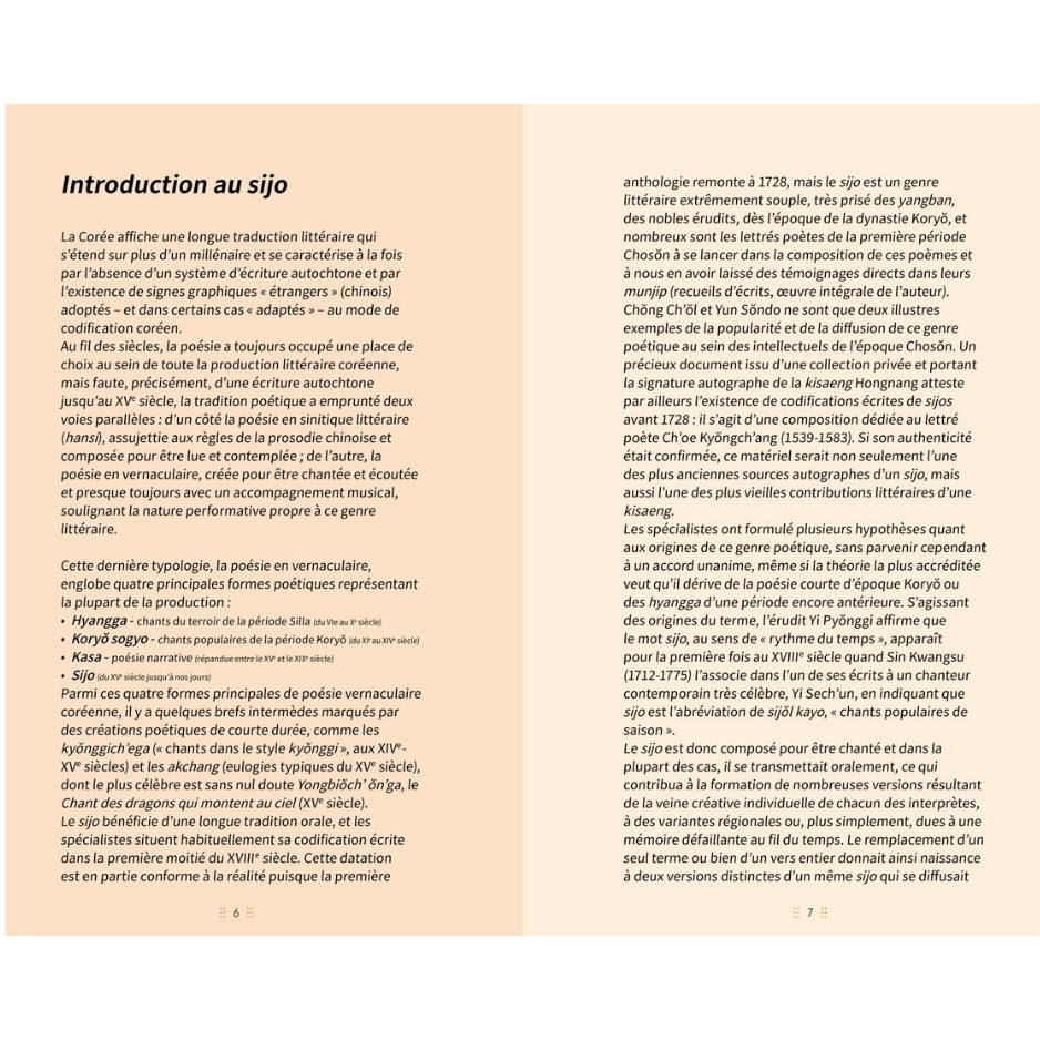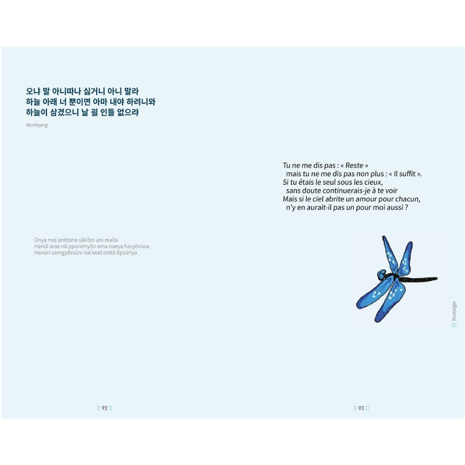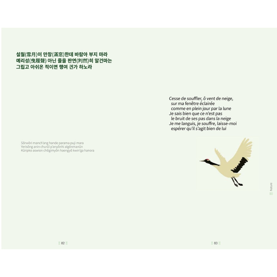 • Chaque poème est présenté en caractères coréens, accompagné de la transcription et de la traduction en français, permettant ainsi à tous les lecteurs de profiter de l'œuvre.