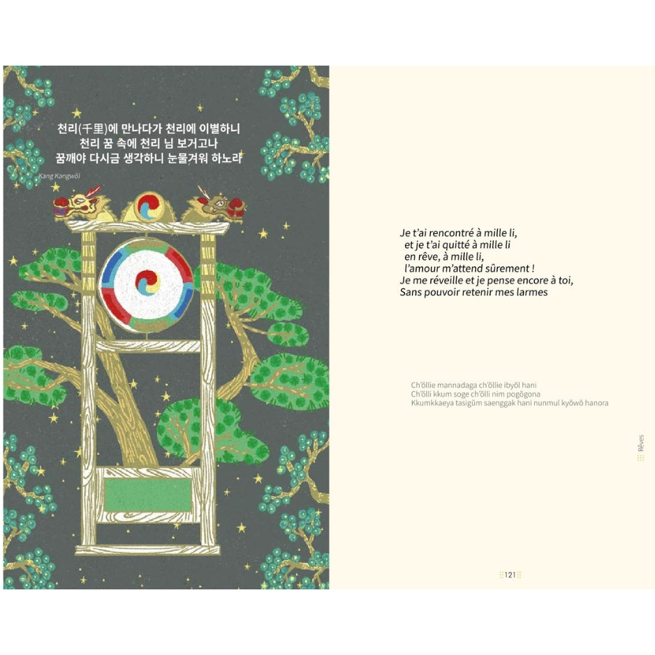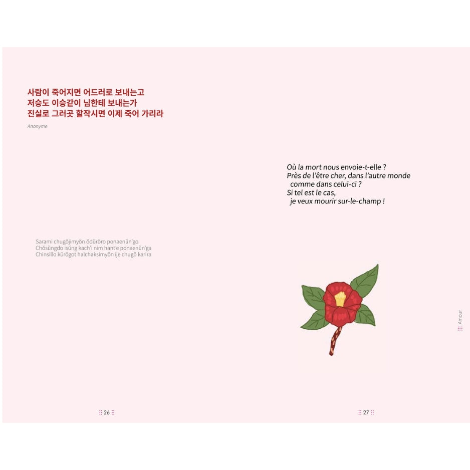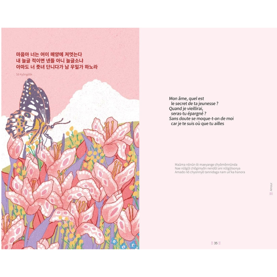 Cet ouvrage se divise en quatre sections, chacune dédiée à l'un de ces thèmes universels : Amour, Nature, Nostalgie et Rêves. Chaque poème est présenté en caractères coréens originaux, accompagné de sa transcription et de sa traduction en français.