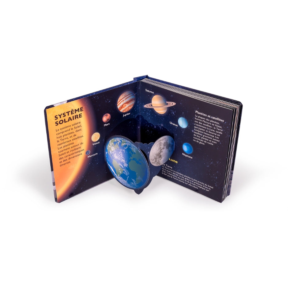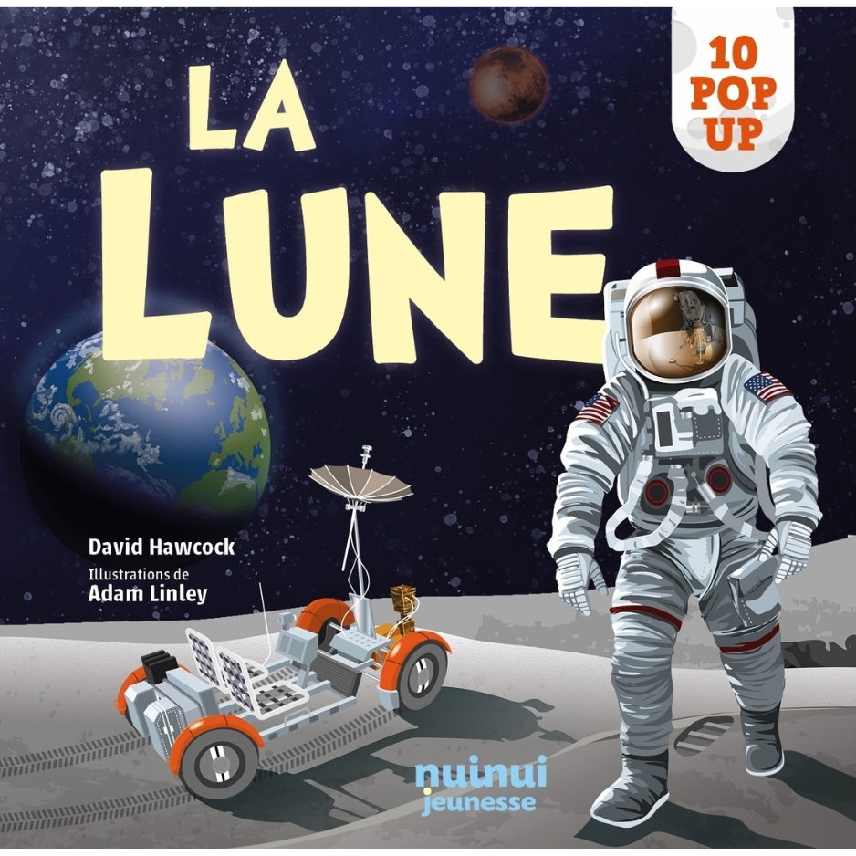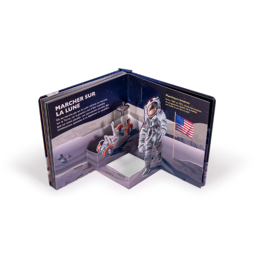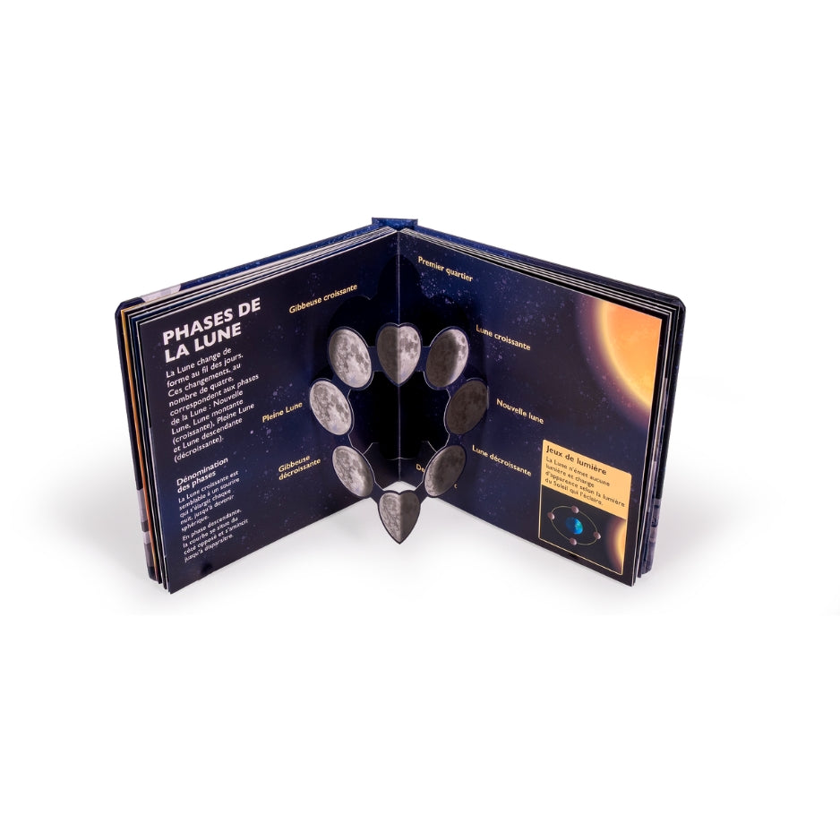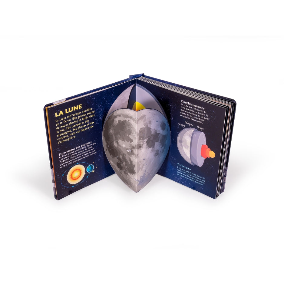Ces questions et bien d’autres trouvent leur réponse dans ce livre, consacré aux merveilles de la Lune, à découvrir à travers les 10 fabuleux pop-up. Les phases lunaires, le Système solaire, la Lune et la Terre, les satellites naturels, les missions lunaires et les explorations spatiales… tout est présenté à travers de nombreuses illustrations colorées, sublimées par 10 pop-up spectaculaires.
