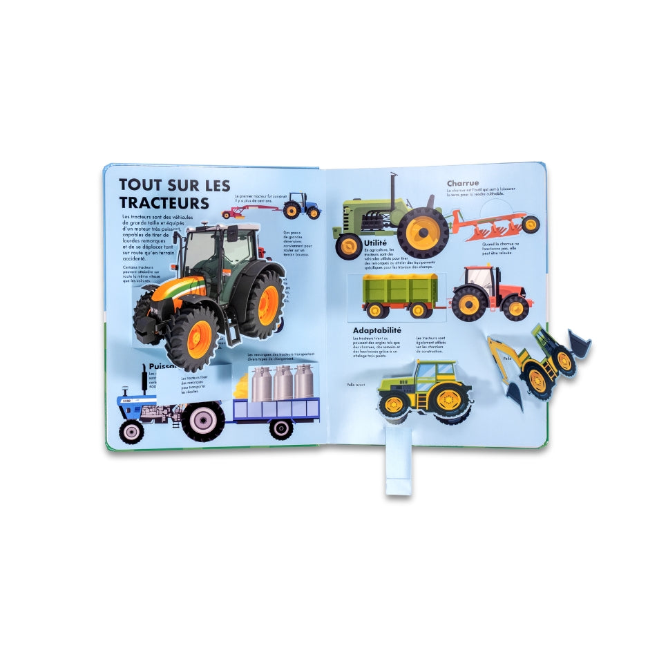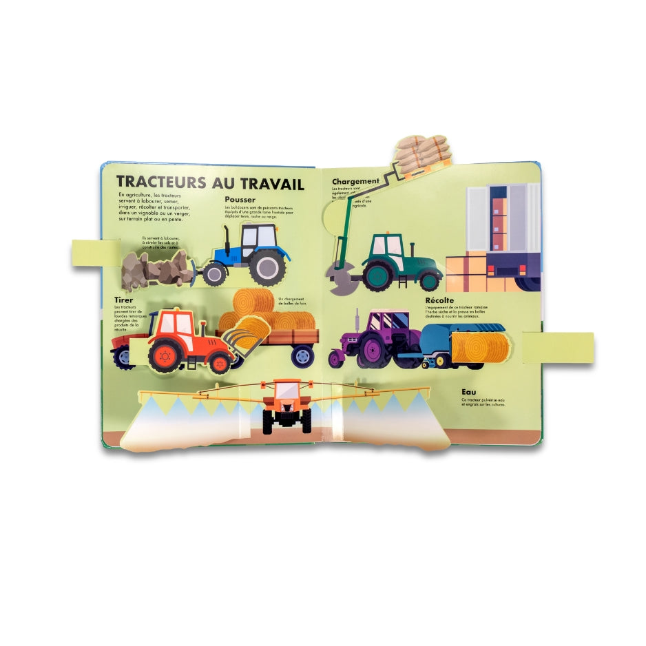 Soulève les volets pour découvrir le moteur d’un tracteur, tire les languettes pour activer le bras d’une pelleteuse, fais tourner les roues pour faire avancer la machine…