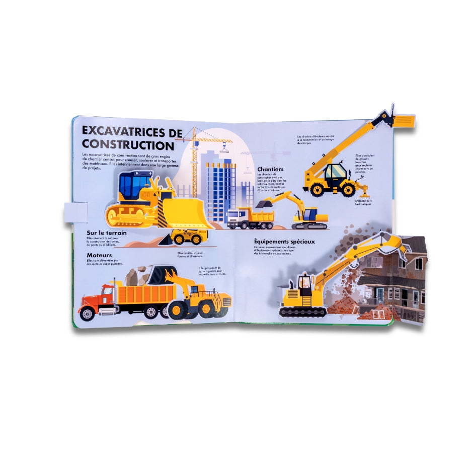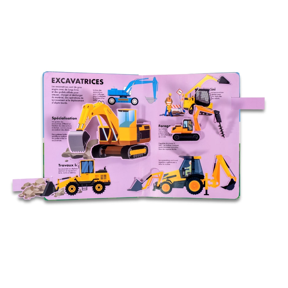 - Un livre animé richement illustré pour explorer l’univers des engins de chantier